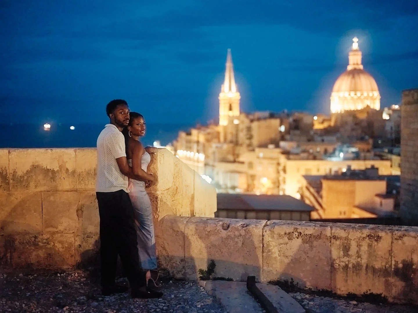 Our final stop was near the Giannini Restaurant viewpoint, overlooking the glowing rooftops of Valletta. By then, the sky was dark, the city alive with light, and Olivia and Jaelen were radiant. Their connection was undeniable — and it truly shone through in the night.