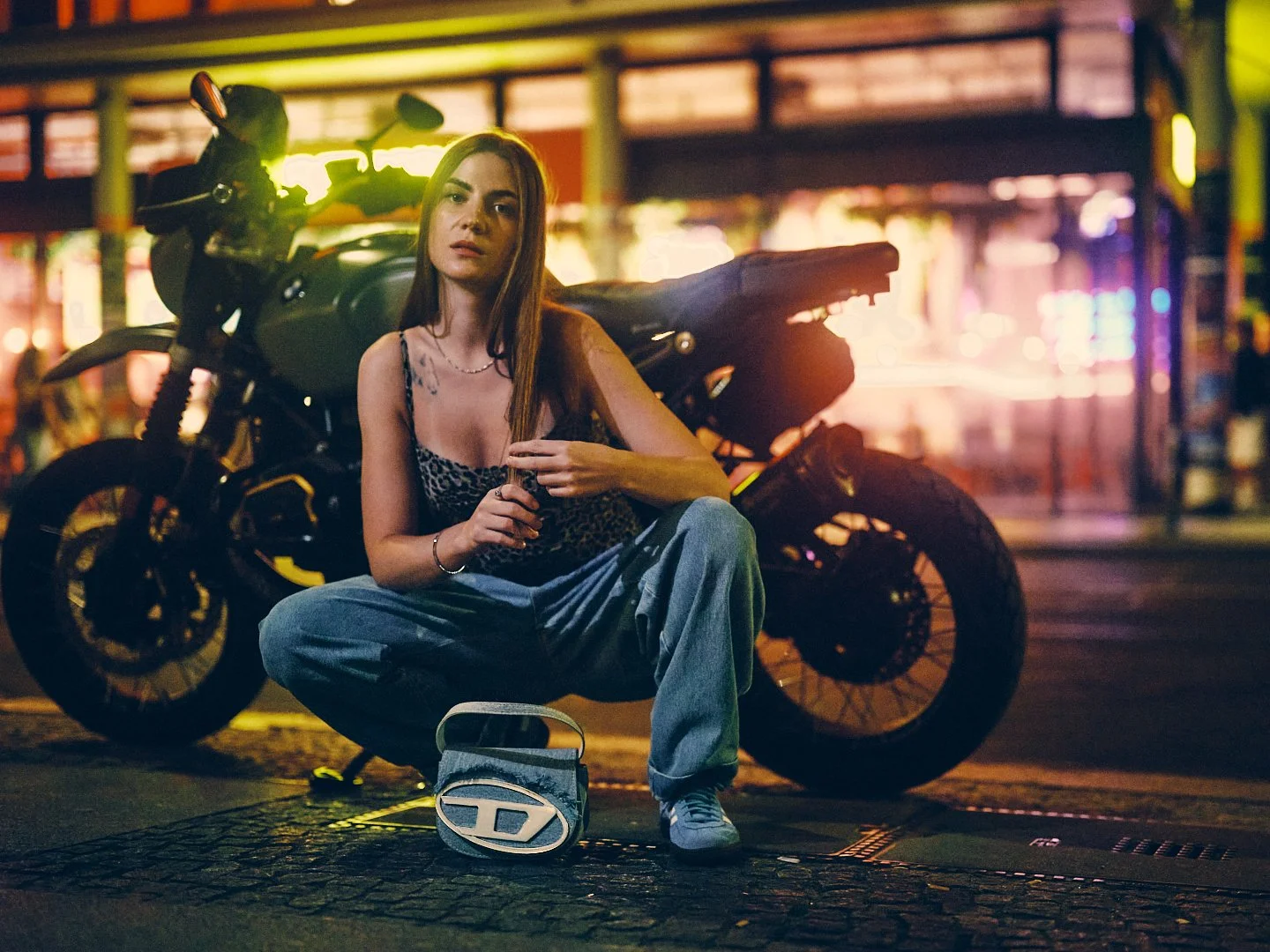 This part of the shoot felt like something out of a cyberpunk film: reflective surfaces, moody shadows, and Olga surrounded by electric color. Her tiger print, wide-leg pants, Diesel jeans bag, and naturally cool energy made it look like a Berlin-meets-Tokyo editorial spread — futuristic, gritty, and deeply stylish.
