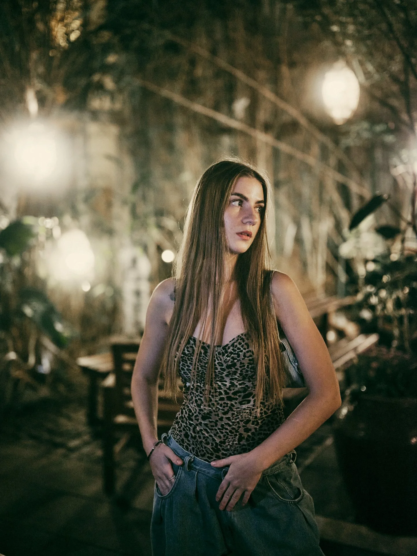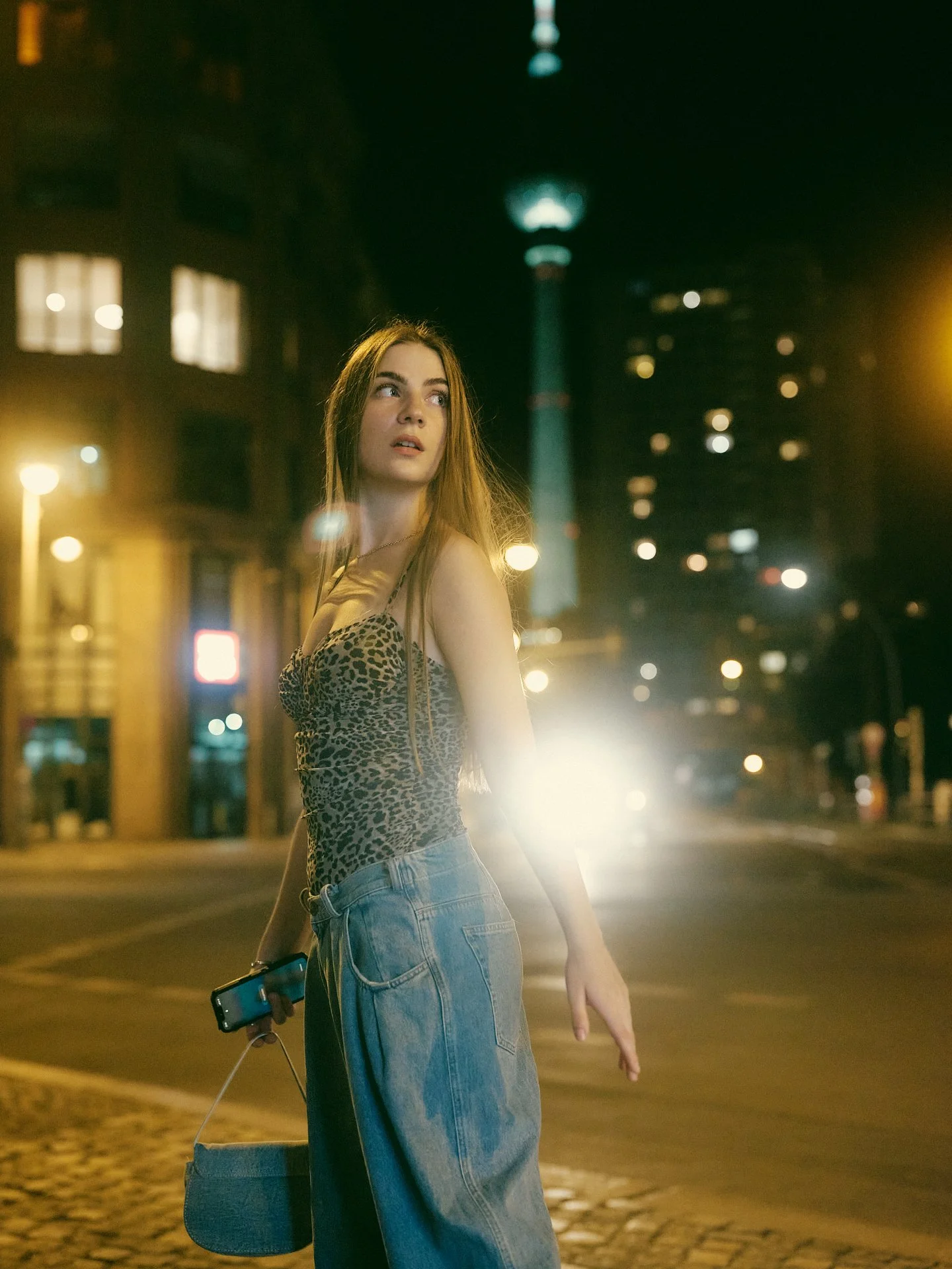 Berlin is one of those cities that always gives more than expected — especially after dark. It was late, my camera battery nearly dead, and the light fading fast. But when Olga, a Ukrainian refugee now living in Berlin, showed up in her tiger print shirt, Gen Z-style jeans, and an undeniable sense of personal style, I knew we had to capture something.